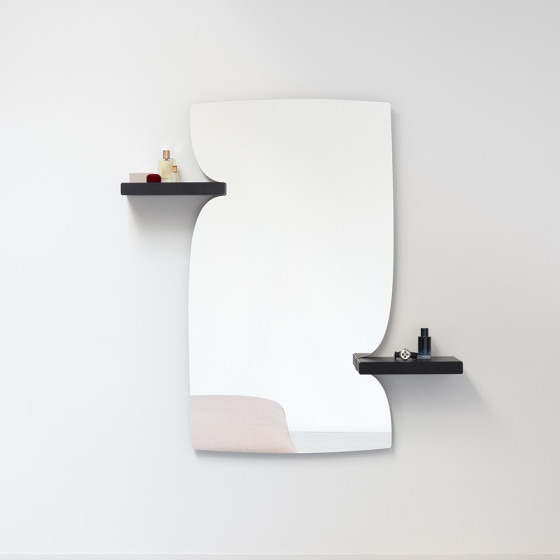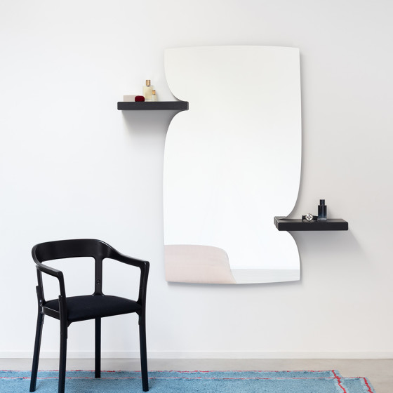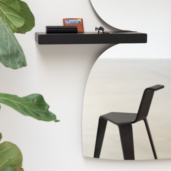 《Morphed Mirror》系列正是這個探索的回應,沒有繁複結構,也不倚賴雕塑般的厚重,而是以最純粹、最簡潔的姿態,將柔軟的形體,凝固於平面與立體之間。有人看見擁抱的弧度、有人看見波浪的推進,也有人看見父母輕扣住孩子臂彎的溫柔,它不僅映照身影,更映照記憶與感受。搭配梣木層板承載日常物件,這件作品就像一個被定格的瞬間,看似靜止,卻在你靠近時,開始呼吸流動。