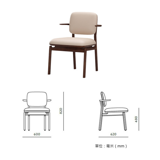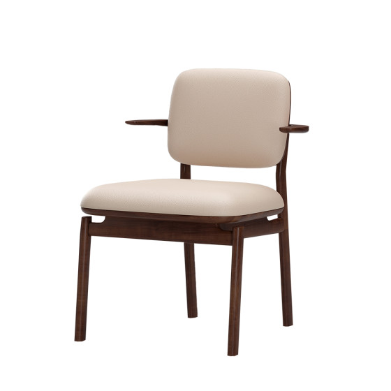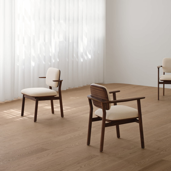 系列椅子的木質結構線條流暢,弧線與直線之間相互平衡,展現克制而精準的比例美感。細緻打磨的輪廓沿著椅身延展,使整體造型更顯俐落。懸浮式座面設計減輕視覺厚重感,讓椅身看起來更加輕盈;金屬背部提把作為細節點綴,在低調中增添質感與精緻度。