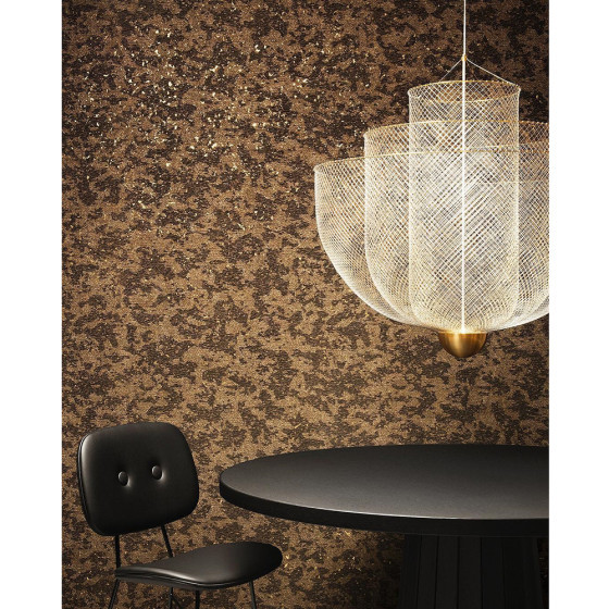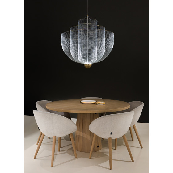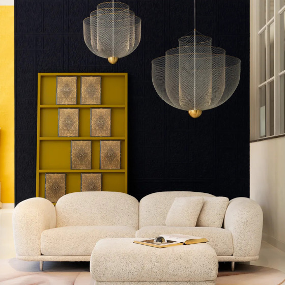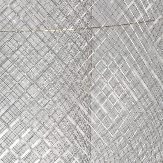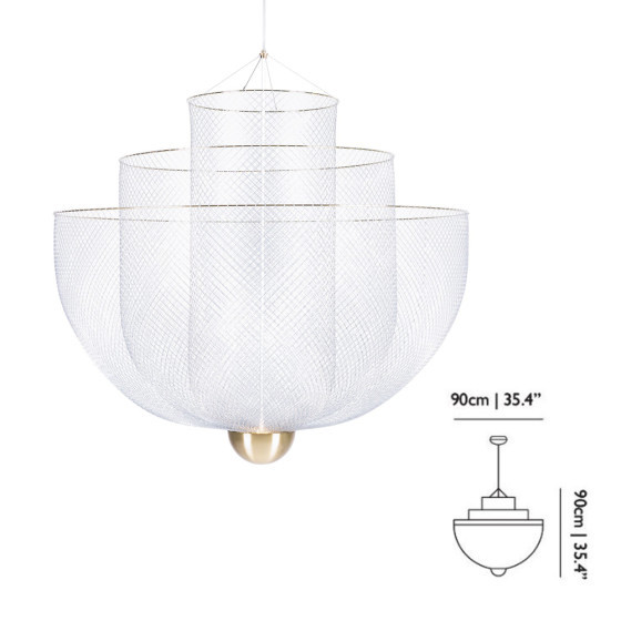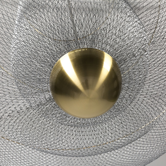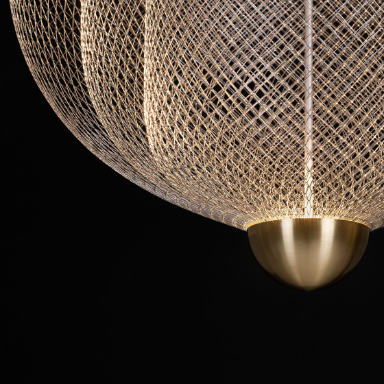 整體燈具以細如髮絲般的金屬絲線經緯交織而成,三種不同的直徑錯落組合增添層次感,遠看彷彿一座沉靜優雅鏤空燈籠,靜靜的飄浮於空中,底部以 LED 光源投射在金屬絲線上,明暗間的對比變化,讓視覺整體呈現更為豐富且迷幻,懸掛空間中更展現非凡的氣質及韻味,徹底展現細膩迷人的空間魅力。