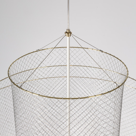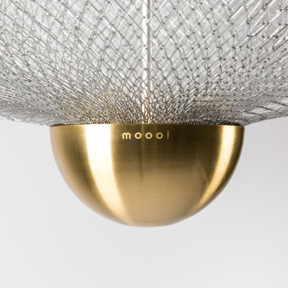 整體燈具以細如髮絲般的金屬絲線經緯交織而成,三種不同的直徑錯落組合增添層次感,遠看彷彿一座沉靜優雅鏤空燈籠,靜靜的飄浮於空中,底部以 LED 光源投射在金屬絲線上,明暗間的對比變化,讓視覺整體呈現更為豐富且迷幻,懸掛空間中更展現非凡的氣質及韻味,徹底展現細膩迷人的空間魅力。