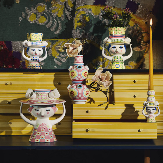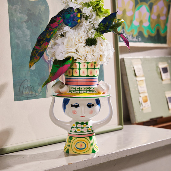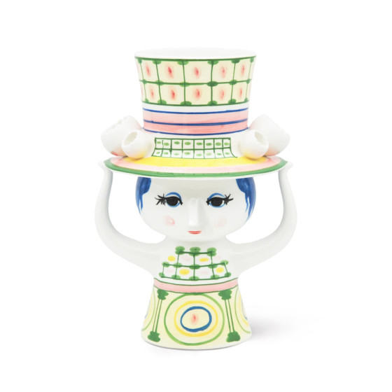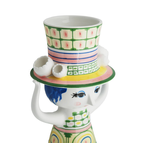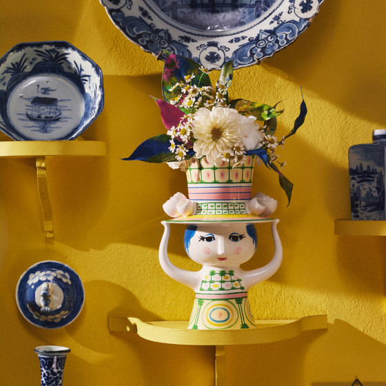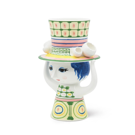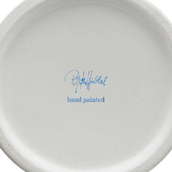 丹麥設計大師 Bjørn Wiinblad 一向鍾情於戴帽人物,在他的設計檔案中,總能看見各式嶄新又充滿玩心的帽子造型。「Lady with Hat」花瓶,帽子如小塔般向上延伸,女子以雙手輕輕扶著;手繪裙身的幾何圖形,搭配帽子上的格紋細節,形成輕巧而優雅的對比,散發出富含想像力的奇幻氛圍。無論插上鮮花或單獨擺放,都能為居家空間增添玩味,而花瓶底部可見 Bjørn Wiinblad 的原始簽名與手繪標記,證明這是一件獨一無二的設計經典。