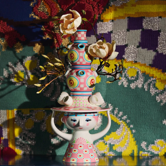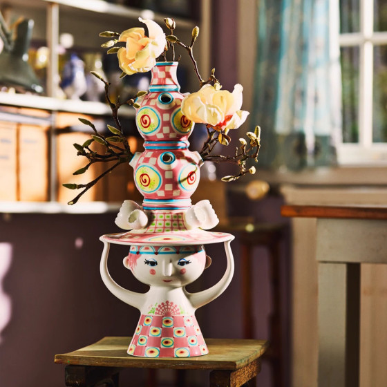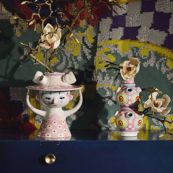 丹麥設計大師 Bjørn Wiinblad 一向鍾情於戴帽人物,在他的設計檔案中,總能看見各式嶄新又充滿玩心的帽子造型。「Lady with Hat」花瓶,帽子如小塔般向上延伸,女子以雙手輕輕扶著;手繪裙身的幾何圖形,搭配帽子上的格紋細節,形成輕巧而優雅的對比,散發出富含想像力的奇幻氛圍。