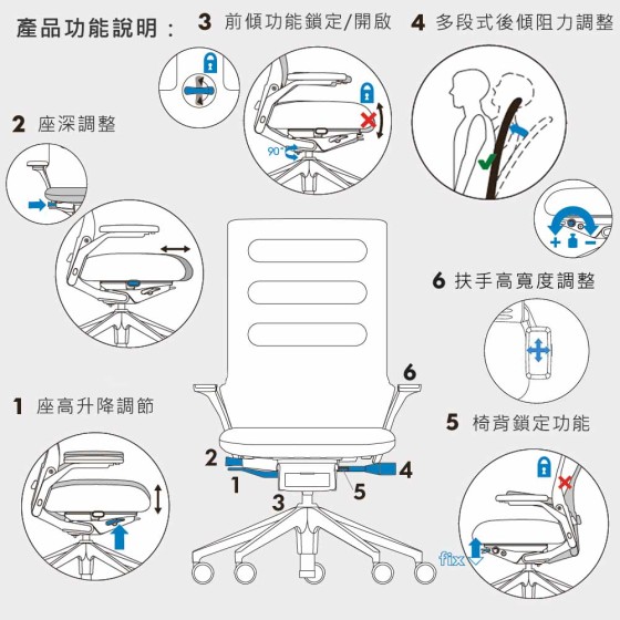 • 椅背多段式傾斜角度阻力調整,並可選擇固定或彈性,依照個人習慣回饋身體完美舒適性。