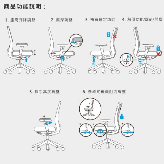 辦公椅調整操作方式請參考影片(點此觀賞)