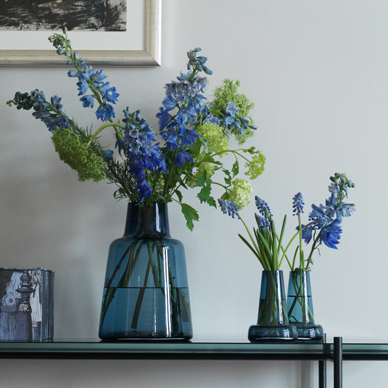 《Flora》花器以清透富層次感的手工吹製玻璃,勾勒出優雅比例,系列作品自設計師 Louise Campbell「讓鮮花自在盛放」的想法出發,重新思考花與容器之間的關係。寬闊瓶身底部為花朵保留充足空間,纖細瓶口則溫柔收束線條,讓一枝長莖花也能自然成為視線焦點。不同玻璃色澤在光線下,映照出各自獨有的氣質,無論插花或單純陳列,都為空間注入低調美感。