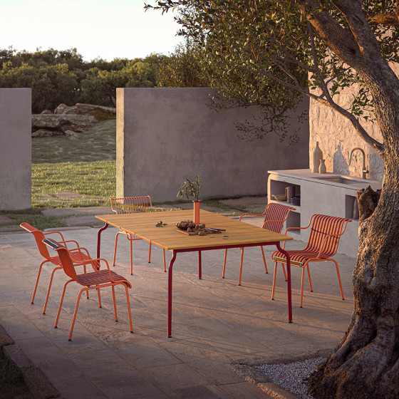 South 系列是專為戶外使用所打造的桌椅系列,從中可看見設計師 Konstantin Grcic 所具備的高敏銳性,結合建築設計的嚴謹精神,以及對科技材料所投入的熱情研究。他將剛硬金屬材質彎曲,勾勒出迷人動態線條,不僅貼合人體舒適曲線,視覺上也自然營造出輕盈的流動感受。