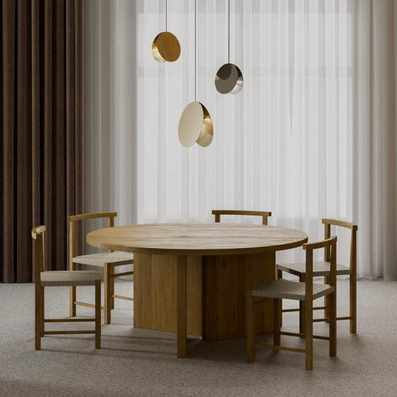 Kaname 桌以歐洲實心橡木製成,獨特的樞軸式桌腳在視覺上顯得輕盈,卻提供穩定而扎實的支撐,展現設計師對比例與平衡的細膩掌握。桌面提供圓形、橢圓形與矩形三種形式,能靈活融入不同尺度與場域需求;天然實心橡木、巧克力棕色與深棕色染色木料,細緻呈現木材原有的紋理層次,為這款雋永設計增添沉穩而優雅的氣質。