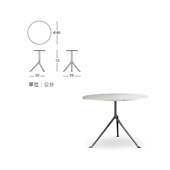 尺寸:直徑 80 x 高 74.5 x 桌腳寬 59 x 桌面厚度 2(公分)