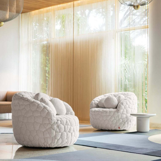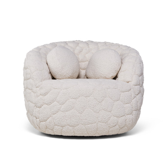 同系列抱枕與毛毯亦出自 Robbie Williams 之手,延續《Introvert Chair》的創作語彙。抱枕選用與椅款相同的混訪面料——初剪羊毛、羊駝毛與棉纖維交織而成,質地細膩柔軟,在提升乘坐與倚靠舒適度的同時,也為日常留下一處情緒得以安放的角落,陪伴片刻靜謐的小憩時光。