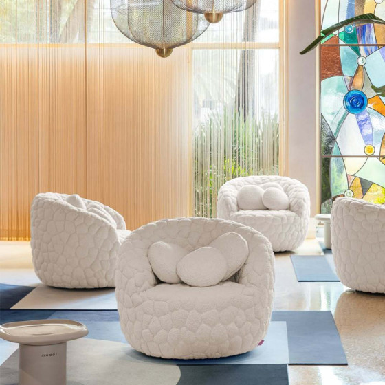 《Introvert》系列是 Robbie Williams(羅比 · 威廉斯)與 Moooi 的跨界設計,旨在創造一道柔軟的情感能量場,或是一個專屬於自己的靜謐避風港。從全球流行音樂偶像到富表現力的視覺藝術家,Robbie 將原始、未經過濾的能量注入藝術創作。自 2023 年起,他的作品陸續在阿姆斯特丹、巴塞隆納與倫敦的 Moco Museum 展出;其中第三場個展《Radical Honesty》首度亮相了《Introvert Chair》。這張椅子延續他對內心世界的探索——焦慮、羞愧、自我、幽默與療癒在同一空間共存,並透過雕塑般的包覆造型,將這份情感轉化為具體而溫暖的舒適體驗。