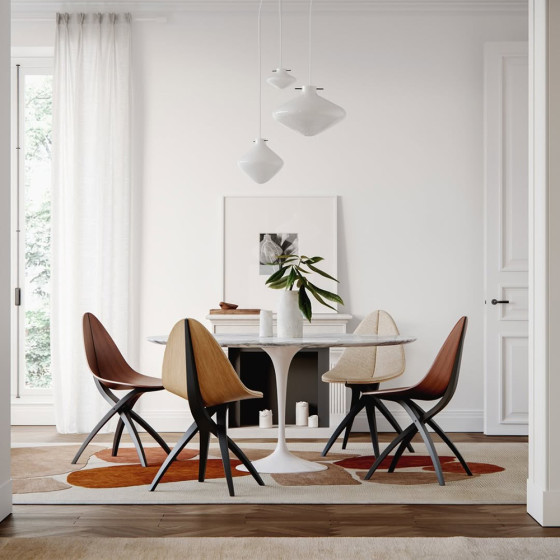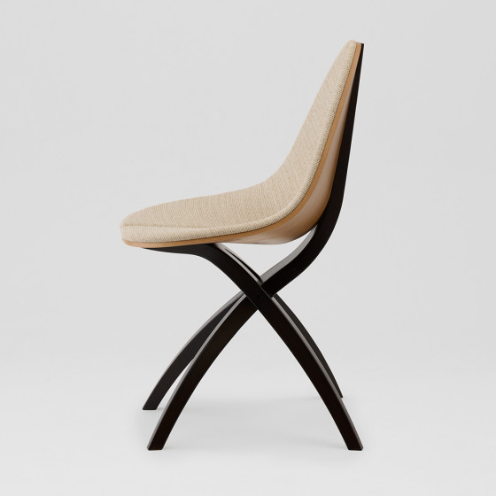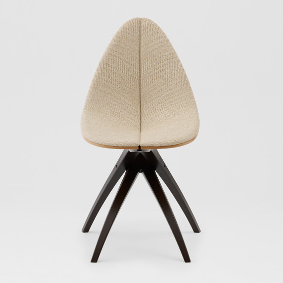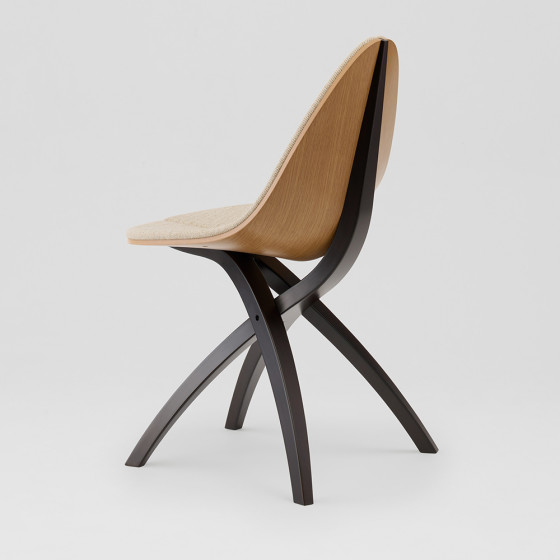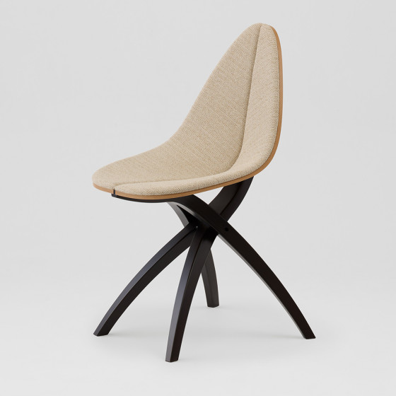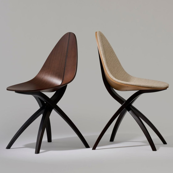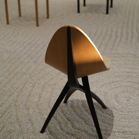 GamFratesi 設計團隊希望打造一種如枝幹般溫柔支撐的結構,輕巧地托起懸浮的座面,彷彿葉片自然依附於枝頭。整體以木質為主要材質,透過不同的加工方式與工藝技法,讓工業化製程之中依然保有自然的紋理與生命感,展現自然之美與結構張力的平衡。