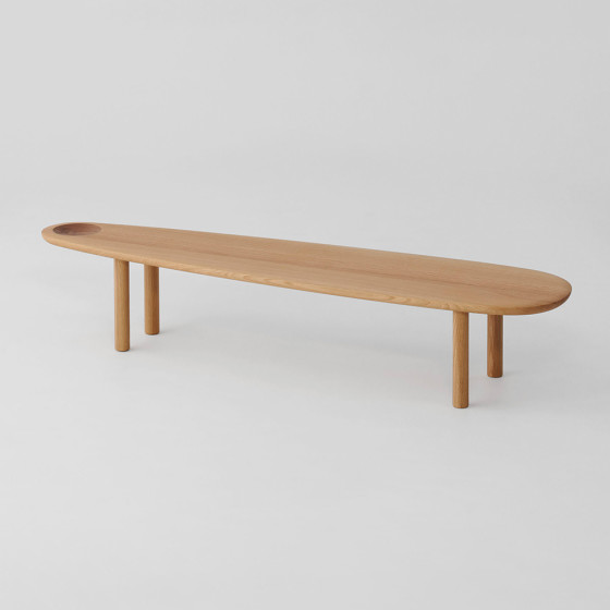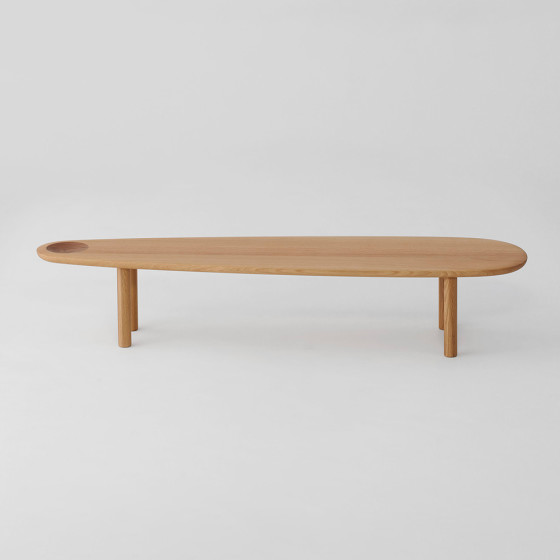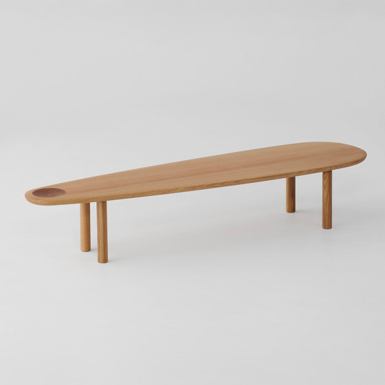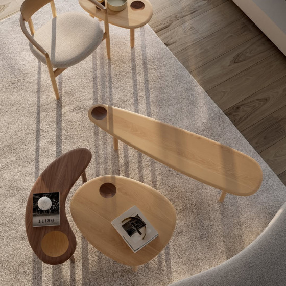 Kigo 邊桌系列由設計工作室 GamFratesi 於 2024 年設計,他們從雕塑家野口勇(Isamu Noguchi)的石雕作品中汲取靈感,在圓弧有機形狀裡,加上標誌性的碗型凹槽,透過深淺兩色木質紋理創造出動態視覺效果。他們從藝術和自然中,捕捉兩個世界的精髓所在,將其轉化為美麗且富有生命力的家具作品,向實木工藝及自然有機之美致敬。