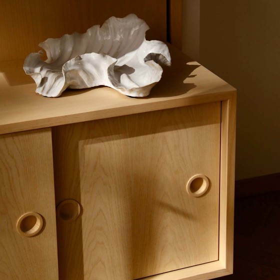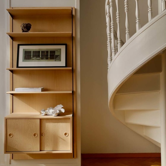 Finn Juhl 於 1953 年設計出 Panel System 壁掛層架系統,並於 2013 年重新推出壁櫃組合。此系統採用模組化設計,櫃體與層板皆可依需求自由調整位置,展現高度靈活性,同時可透過多種木料材質、色彩與收納櫃的搭配組合,組合出近乎無限的配置可能,在形式與機能間取得恰到好處的平衡,是一套經典現代且具靈活性的動態收納方案。