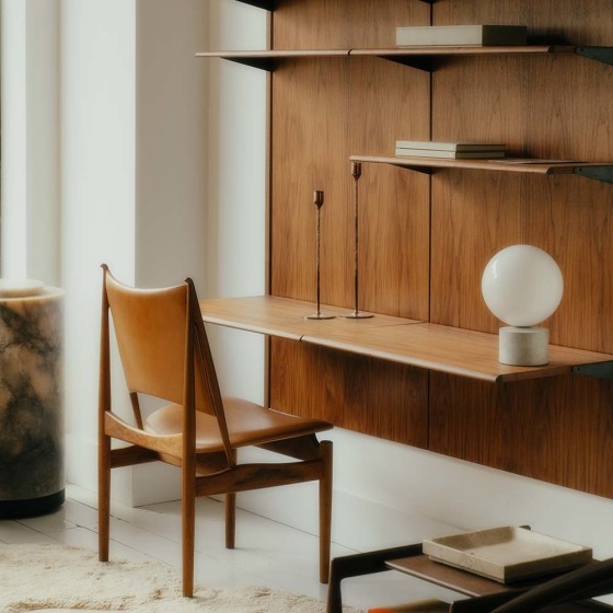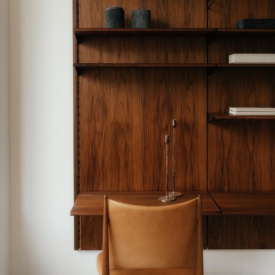 Finn Juhl 於 1953 年設計出 Panel System 壁掛層架系統,並於 2013 年重新推出壁櫃組合。此系統採用模組化設計,櫃體與層板皆可依需求自由調整位置,展現高度靈活性,同時可透過多種木料材質、色彩與收納櫃的搭配組合,組合出近乎無限的配置可能,在形式與機能間取得恰到好處的平衡,是一套經典現代且具靈活性的動態收納方案。