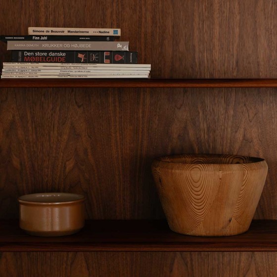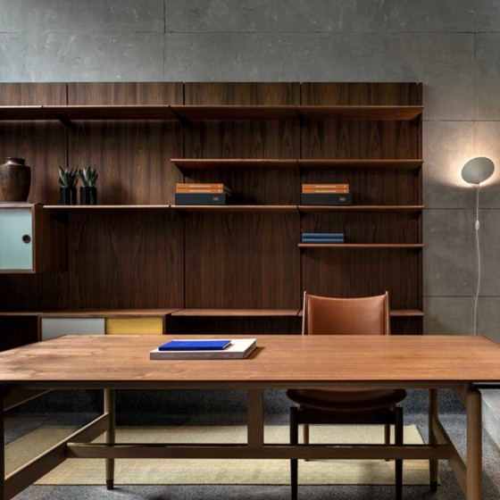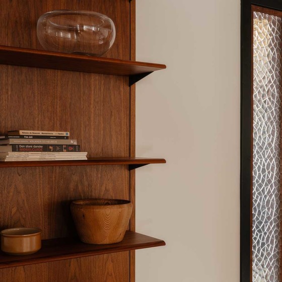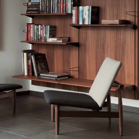 Finn Juhl 於 1953 年設計出 Panel System 壁掛層架系統,並於 2013 年重新推出壁櫃組合。此系統採用模組化設計,櫃體與層板皆可依需求自由調整位置,展現高度靈活性,同時可透過多種木料材質、色彩與收納櫃的搭配組合,組合出近乎無限的配置可能,在形式與機能間取得恰到好處的平衡,是一套經典現代且具靈活性的動態收納方案。
