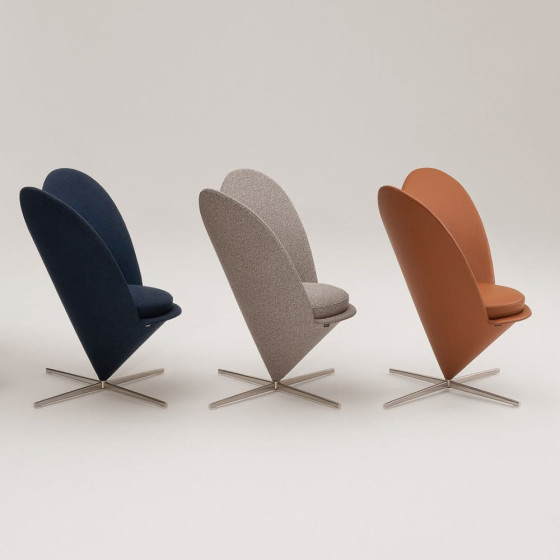 以布料完整包覆獨特的圓錐形椅身,借用 Panton 摯友 Niels-Jørgen Kaiser 於 Panton 訃聞中的精妙描述:「Cone Chair 宛如一位踮起腳尖旋轉的芭蕾舞者」,輕盈而富有張力,一舉改變了 1950 年代後期人們對座椅形式的想像。當年於紐約櫥窗展出時,吸引大批行人駐足圍觀,一度造成交通阻塞,成為話題焦點,也奠定了 Verner Panton 在國際設計舞台上的地位。