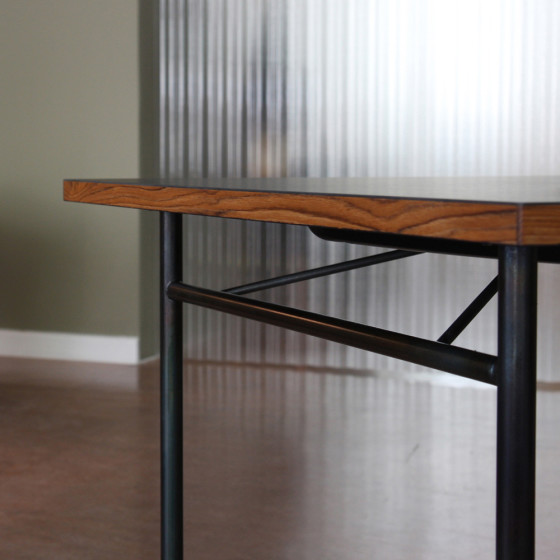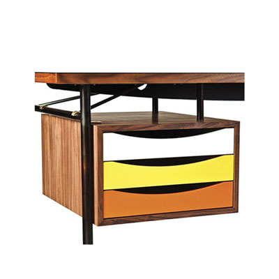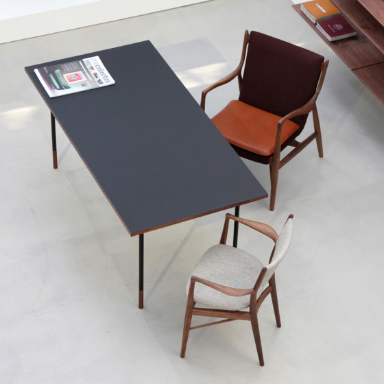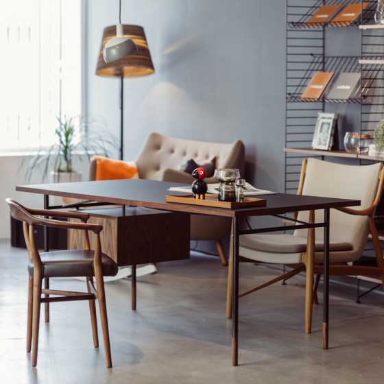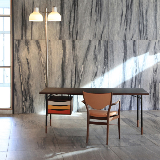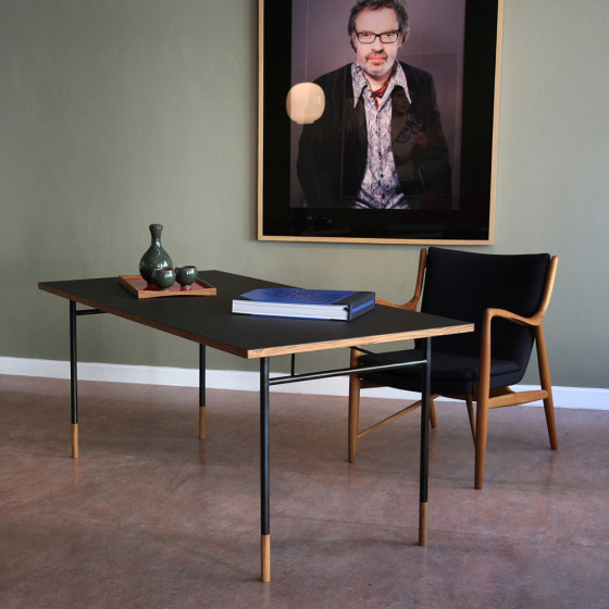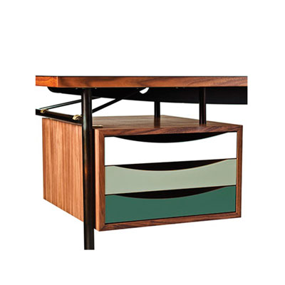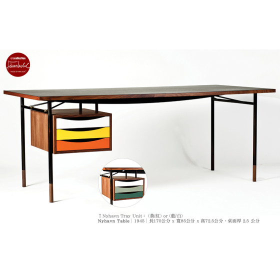 1945 年對 Finn Juhl 來說是個重要的一年,這年他不僅在哥本哈根 Nyhavn 成立了事務所,更打造出設計生涯具有重大意義的一張 Model 45 Chair,同年又為自己量身訂做了 Nyhavn 工作桌,直到 1957 年 Finn Juhl 將辦公室遷移到 Sølvgade 時仍在使用。其鋼架配以原木桌緣及桌腳,不只成為柔韌卻溫暖的實用作品,也是歷經大師多年使用,穩固又簡單的經久證明,可謂 Finn Juhl 少件的鋼管家具經典作品之一。