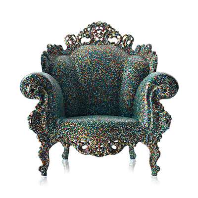Proust 扶手椅至今已使用銅、陶瓷甚至大理石發展出許多版本,並典藏於世界知名博物館內。Mendini 在 2011 年重新為 Magis 設計了貼近生活的實用版,Magis 運用滾塑成型技術,緩慢旋轉經過加熱的空心模具,讓椅子能量化生產。而你一定猜的到,這件原本只能待在室內的藝術品,在經過 Magis 的製造後,變身成防水抗 UV、質量輕盈、堅固耐用的塑料好椅子,不必擔心家中小寶貝和寵物調皮搗蛋而造成的破壞。而明亮現代感的色彩與歐式古典外型結合,具有衝突性卻又絲毫不違和的美感,在室內或室外擺放一張 Proust 扶手椅,創造空間亮點,細膩地打造巴洛克式古典風韻。