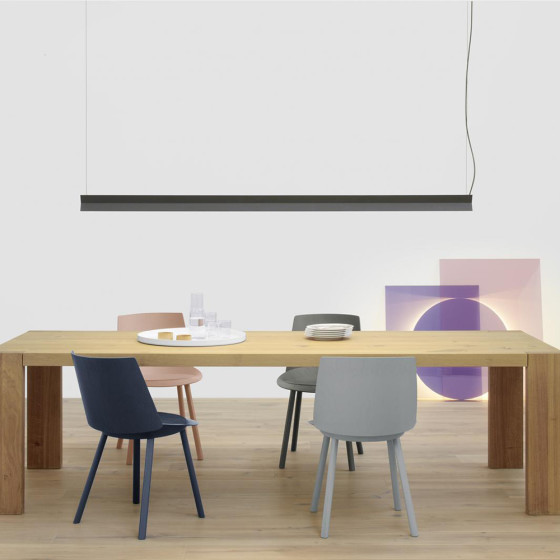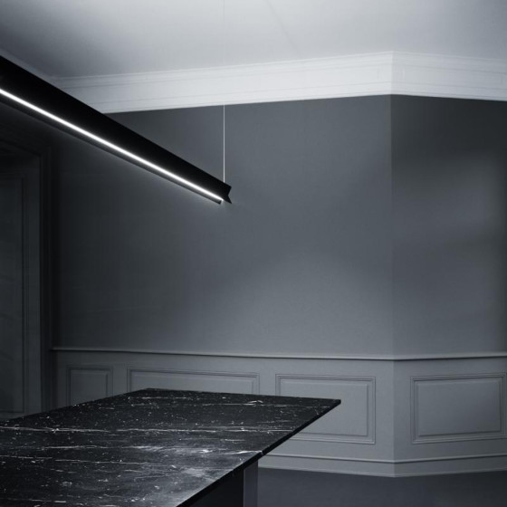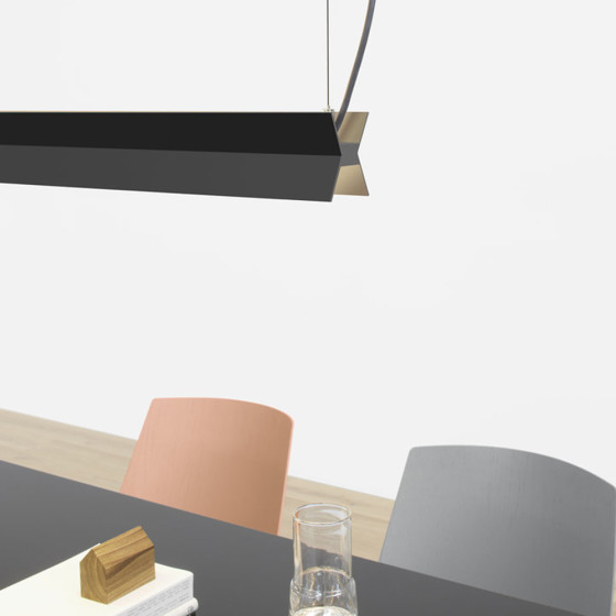 懸掛半空中的 Span 橫式吊燈,於兩點一線間取得巧妙平衡,完美橫跨於室內空間的俐落直線,其橫式燈罩外觀只有 8 公分高,輕薄如羽,讓人不禁忽略它作為「燈」的照明存在,如自然光源般融入周遭,沉浸其中,令人察覺不出,但其實它一直都在。