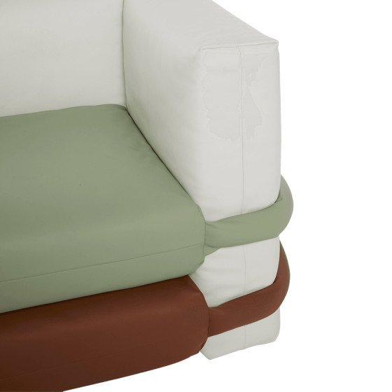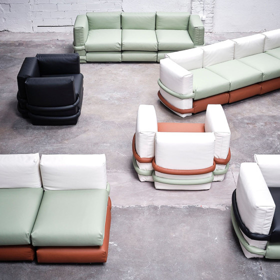 由比利時藝術家雙人組 Muller Van Severen 設計了《Pillow Sofa》沙發系列,最初於 2021 年構想,受到設計服飾品牌 KASSL Edition 經典《Pillow Bag》啟發的延伸作品。Muller Van Severen 一向以雕塑的造型語言與對材質的細膩探索聞名,他們擅於跨越藝術、建築與日常文化間的界線,將直覺與趣味性注入作品,使設計自然遊走於跨界之間。 這款沙發延續了他們獨特的創作視角,將品牌自由靈活的精神帶入家具領域。