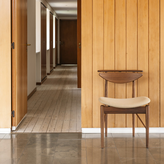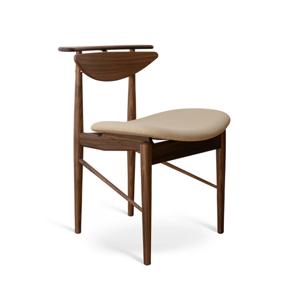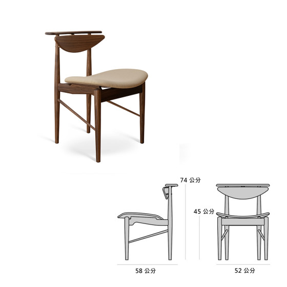 雖然精簡了結構,但別以為他就此放下藝術堅持。除了以懸架保持椅背間隙讓單椅看起來輕盈,從側面觀看更才發現刻意被突起的座架,將曲面座墊騰空架起;若自一般視角看,座墊令人有一種漂浮的錯覺,展現出 Finn Juhl 出色的前衛實驗特質。