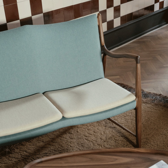 Finn Juhl 在 1945 年的櫥櫃製造商協會展覽會上,首次展出了 45 Chair,同年他將這個想法延伸,發展出 45 Sofa 雙人沙發。為慶祝其問世 80 週年,特別推出全球限定 80 張的 45 Sofa 雙人沙發。作品完整延續其漂浮結構,將雕塑般的姿態延伸為更寬闊的比例,展現柔韌而優雅的設計。以不同材質詮釋經典,布料款以如水彩畫般的柔和質地呈現輕盈生活氣息,皮革款則選用頂級胡桃色皮革,展現內斂奢華質感。每件作品皆鐫刻專屬編號,象徵設計傳承的珍稀印記。這不僅是一張沙發,更是一段跨越八十年的工藝傳奇。