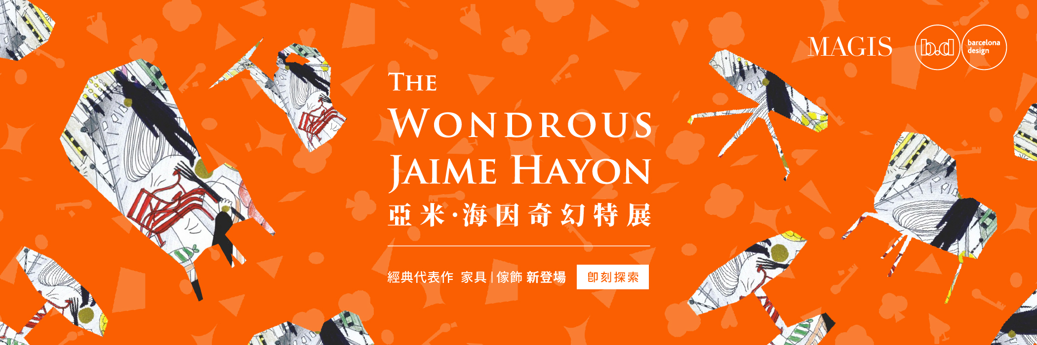 以「The Wondrous Jaime Hayon 亞米‧海因奇幻特展」為主題策劃,精選極具代表性的家具及家飾,一窺大師如何大膽地將幽默與奇幻注入設計,感受創意與生活的緊密連結,躍進 Hayon 式的夢遊嬉戲設計世界!