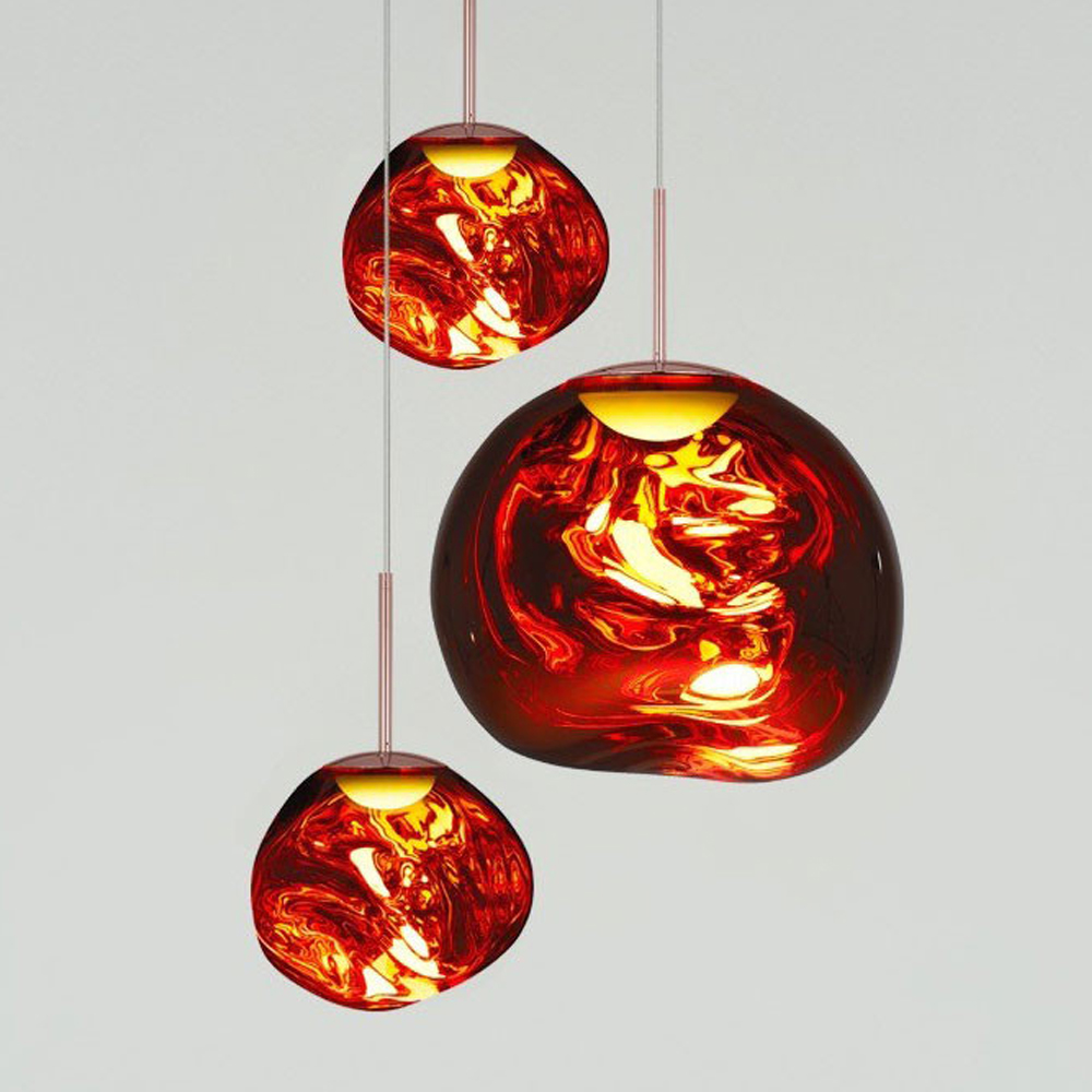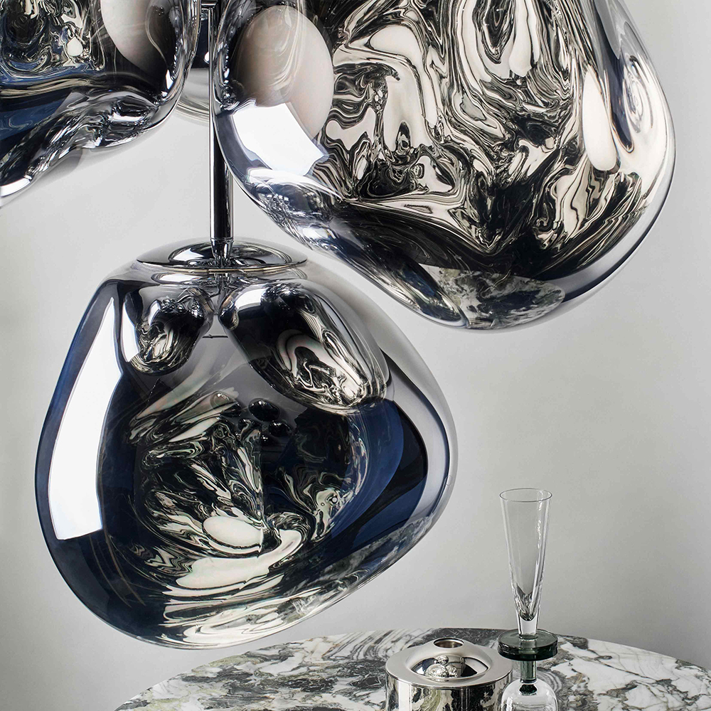 Melt 燈飾採用高度耐熱、高透光,且不易變質的環保無毒塑料,先高壓形塑成不規則外形,再將紅銅、鉻及黃金等金屬,以真空電鍍的方式,自內部細緻霧狀上色,使表面不會因摩擦而落漆。在關燈與開燈的差別下,Melt 呈現出截然不同的光彩風貌:燈暗時,像一顆鏡面金屬球,隱隱閃耀著誘人光澤,燈一亮,電流般光束彷彿令時空瞬間扭轉,使觀賞著陷入深邃絢爛的銀河之中。