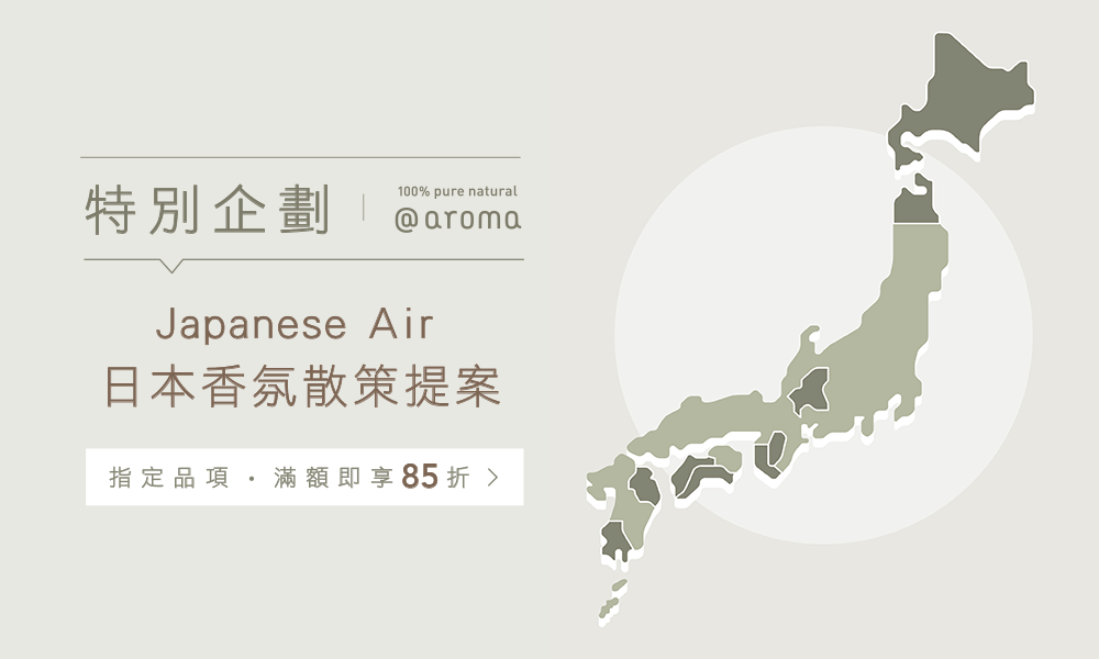 日本第一芳香精油品牌 @aroma,為體現日本深邃的自然與文化,所推出 Japanese air 日式本真精油系列,以日本原生植物或日式場景為靈感而設計,從最南的鹿兒島到最北的北海道,萃取多種珍貴的花葉、樹木及果實等在地植物為基底,將屬於日本的美好香氣透過香氛傳遞。豐富而有靈性的香氣縈繞空間,沁人心脾。