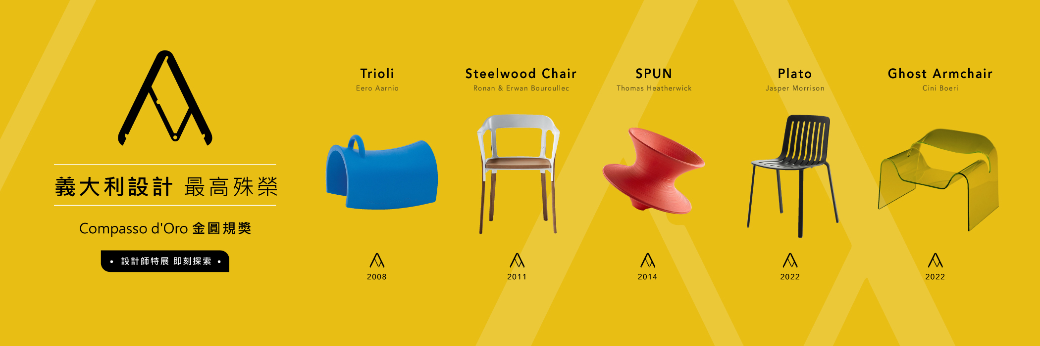 特別挑選九位獲獎設計師的精彩作品,包含義大利國寶級建築設計師 Antonio Citterio、獲頒義大利最高國家勳章的 Cini Boeri、以及有義大利設計教父之稱的 Giulio Cappellini;除了義大利設計師外,也包含其他國際級大師,如以童趣設計聞名的 Eero Aarnio、崇尚極簡主義的 Jasper Morrison、工業設計型男 Konstantin Grcic、法國設計狂人 Philippe Starck、鬼才兄弟檔 Ronan & Erwan Bouroullec、及曾獲英國設計奧斯卡的 Thomas Heatherwick。