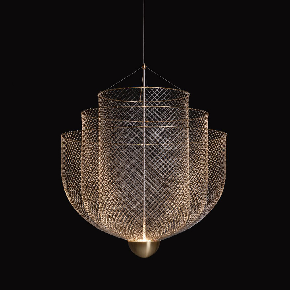 遠看時彷彿一座沉靜優雅鏤空燈籠,靜靜的飄浮於空中,荷蘭設計師 Rick Tegelaar 所創作的 Meshmatics Chandelier 光織夢影吊燈為「光」賦予了美好且獨特的存在!燈具底部以 LED 光源投射在金屬絲線上,明暗間的對比變化,懸掛空間徹底展現細膩非凡的空間魅力。