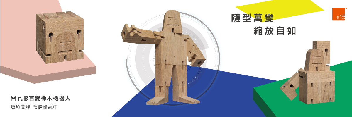 為了提供更豐富的居家搭配靈感,e15 與知名紐約設計工作室 David Weeks Studio 聯手打造 - Mr B 百變橡木機器人,將充滿童趣的機器人化身成為最溫暖的居家擺飾,經由雙方團隊的腦力激盪,讓 MR B 先生不僅擁有呆萌真摯的討喜樣貌,透過9個可順暢旋轉的關節零件,更賦予他縮放自如的天賦技能,左推右轉的變身過程,更是考驗您的拚圖技巧及邏輯思考,無論是贈禮或收藏,都是會讓人一掃壞心情的療癒首選!